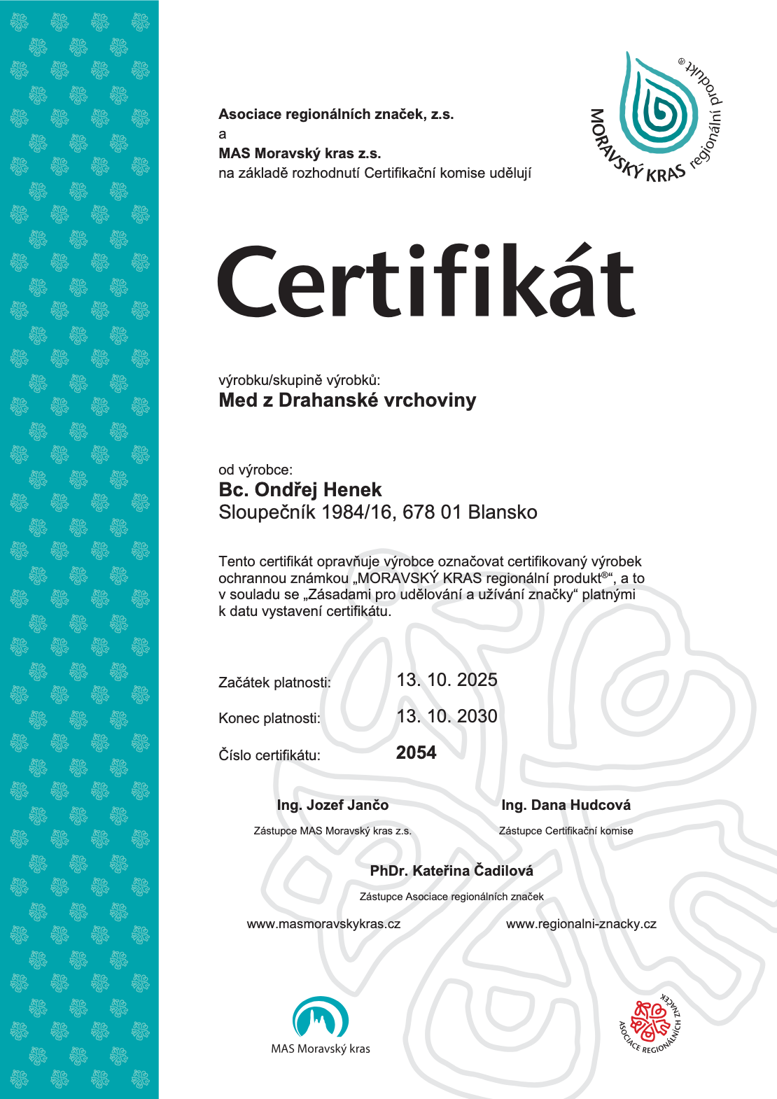 Certifikace Náš med nese oficiální certifikaci „Moravský kras – regionální produkt®“. Je to potvrzení pravého původu, poctivého zpracování a kvality, kterou garantuje certifikační komise MAS Moravský kras a Asociace regionálních značek.