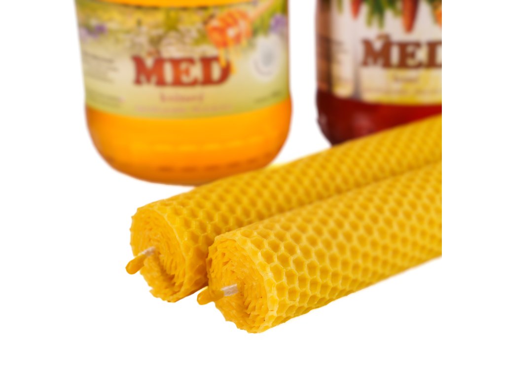 Součástí sady jsou dva druhy medu – jemný květový med a chuťově výraznější lesní med, které doplňují dvě stáčené svíčky z čistého včelího vosku. Svíčky mají přirozenou medovou vůni, hoří klidným plamenem a vytvářejí příjemnou atmosféru.